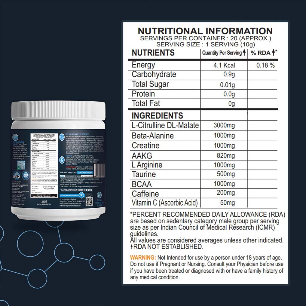 MDB Mad Maxx Pre Workout offers numerous benefits for enhancing the athletes performance in and out. This contains ingredients that can improve energy levels, enhance focus and mental clarity, and increase endurance during exercise. MDB Mad Maxx Pre Workout is packed with various ingredients such as Caffeine, Creatine, and Beta-Alanine, which can help to improve strength and power output. Additionally, MDB Mad Maxx Pre Workout supplement may help to reduce muscle soreness and fatigue, allowing individuals to recover more quickly and efficiently after workouts.